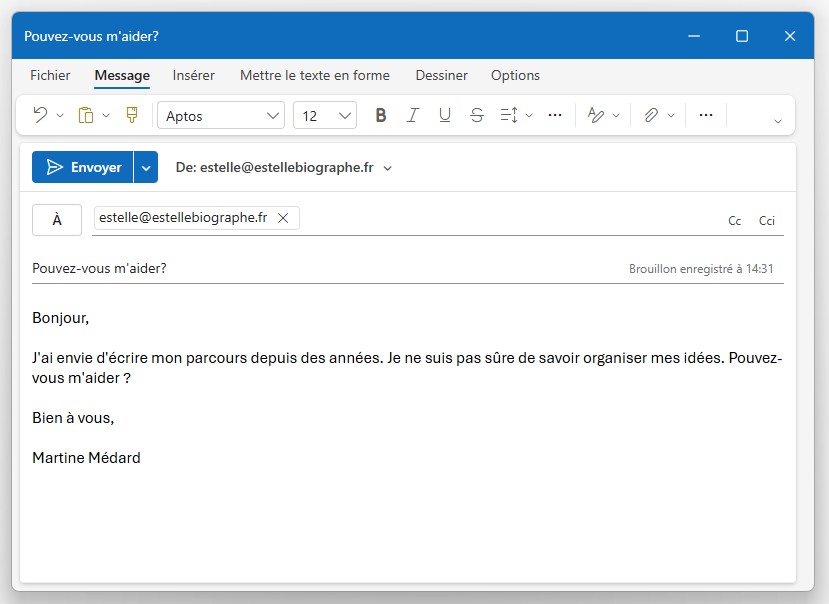 J'ai plaisir à écouter tous les projets d'écriture et je réponds à chacun avec attention. Merci de tout cœur pour votre intérêt.